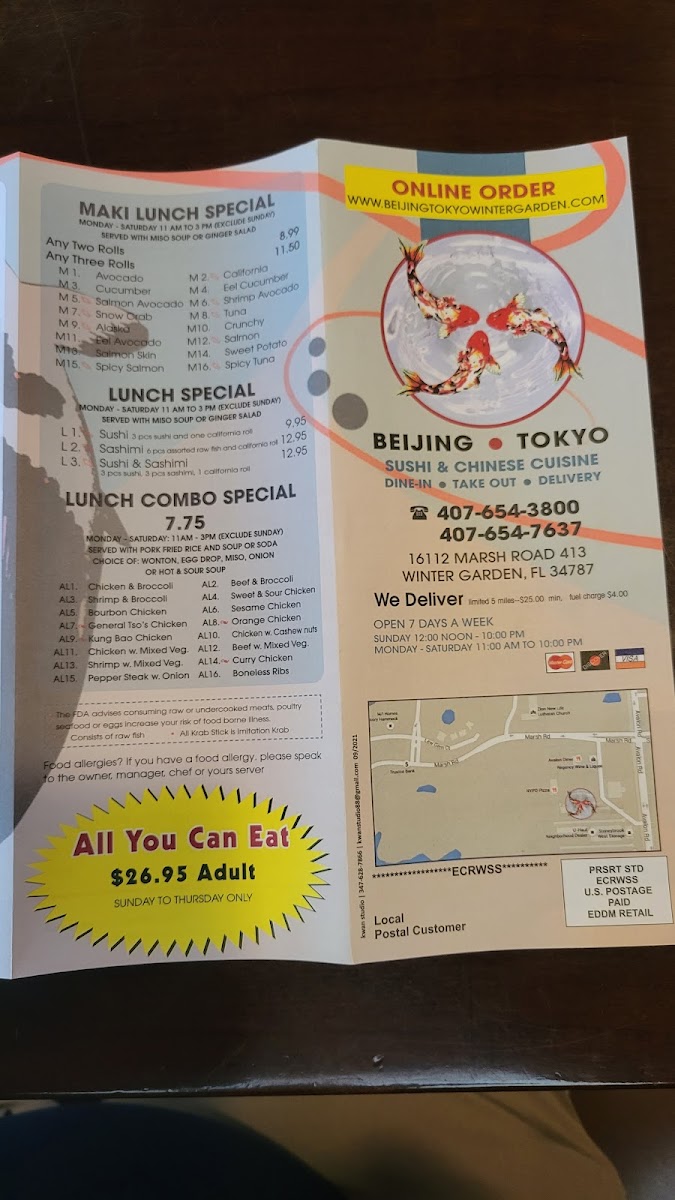 Located in Winter Garden, FL, BEIJING TOKYO is a culinary gem that brilliantly marries authentic Chinese flavors with Japanese influences. With a warm, tidy ambiance, it offers a refreshing escape from the typical Americanized Chinese dining experience.